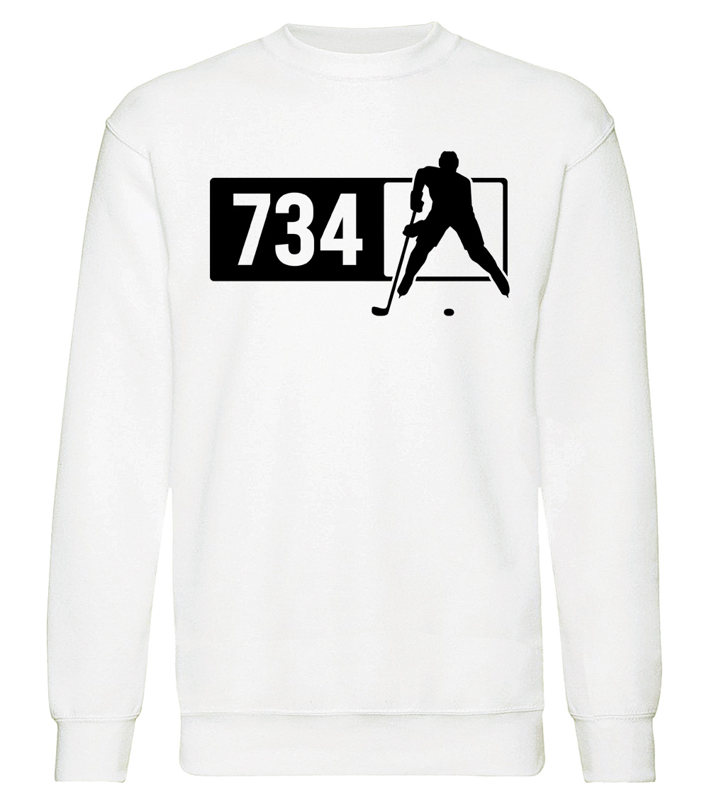 This premium blend sweatshirt proudly displays the Michigan area code 734 in combination with our trademark silhouette. The fabric weight is 8.8 ounces and made from 65% ring spun cotton and 35% polyester. Wash on cold and air dry.