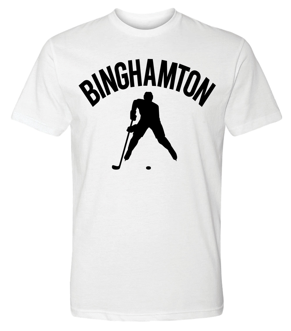 This premium tri-blend short sleeve shirt proudly displays the hockey loving city of Binghamton, USA in combination with our trademark silhouette. The fabric weight is 4.5 ounces and made from 25% ring spun cotton, 25% rayon, and 50% polyester. Wash on cold and air dry.