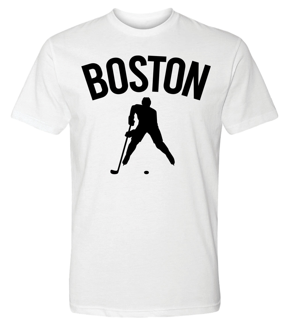 This premium tri-blend short sleeve shirt proudly displays the hockey loving city of Boston, USA in combination with our trademark silhouette. It's design #1 of 2 for Boston. The fabric weight is 4.5 ounces and made from 25% ring spun cotton, 25% rayon, and 50% polyester. Wash on cold and air dry.