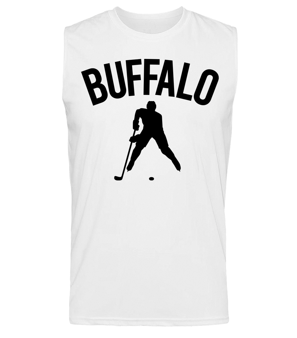 This premium sleeveless muscle shirt proudly displays the hockey loving city of Buffalo, USA in combination with our trademark silhouette. The fabric weight is 4 ounces and made from 100% polyester. Wash on cold and air dry.