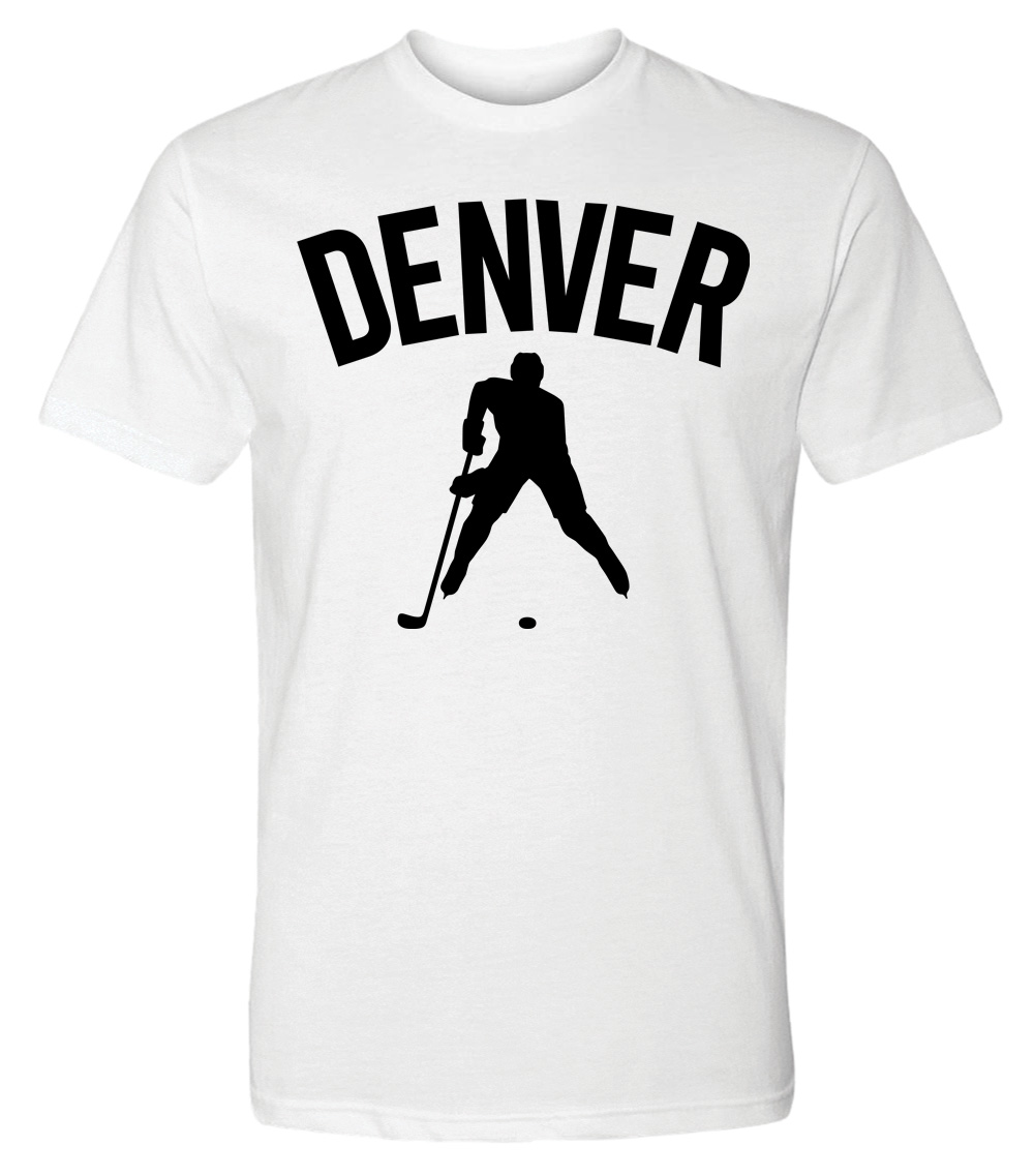 This premium tri-blend short sleeve shirt proudly displays the hockey loving city of Denver, USA in combination with our trademark silhouette. It's design #1 of 2 for Denver. The fabric weight is 4.5 ounces and made from 25% ring spun cotton, 25% rayon, and 50% polyester. Wash on cold and air dry.