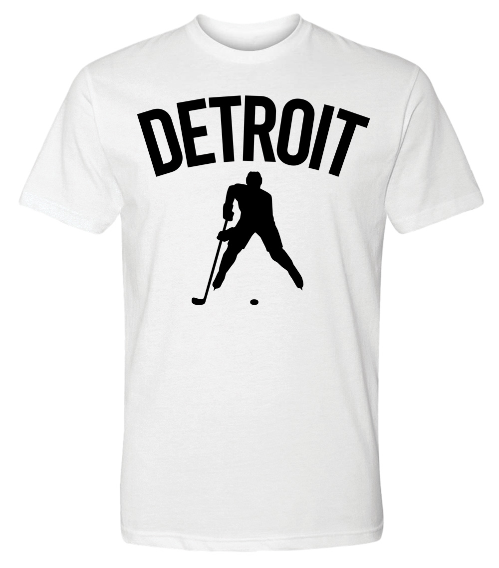 This premium tri-blend short sleeve shirt proudly displays the hockey loving city of Detroit, USA in combination with our trademark silhouette. It's design #1 of 2 for Detroit. The fabric weight is 4.5 ounces and made from 25% ring spun cotton, 25% rayon, and 50% polyester. Wash on cold and air dry.