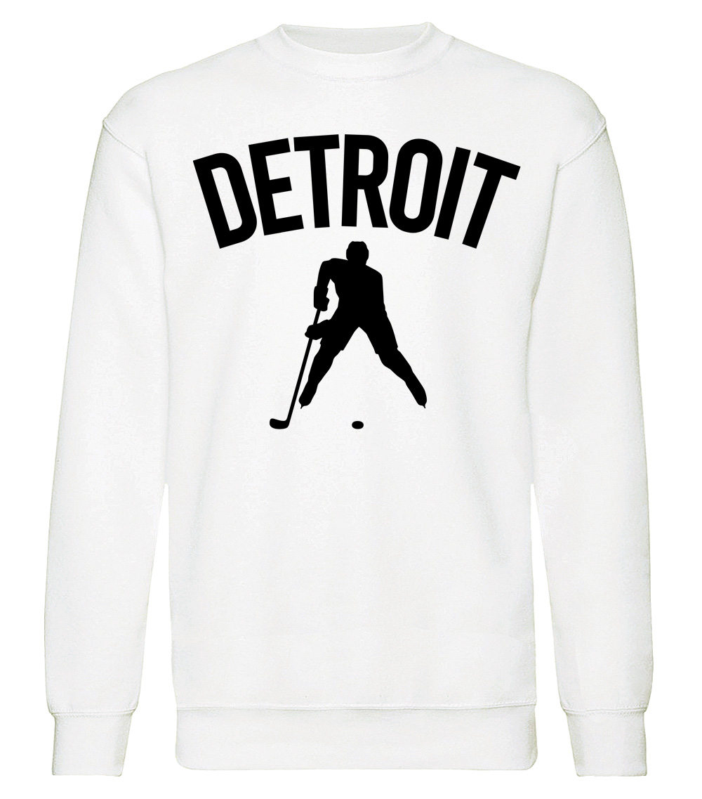 This premium blend sweatshirt proudly displays the hockey loving city of Detroit, USA in combination with our trademark silhouette. It's design #1 of 2 for Detroit. The fabric weight is 8.8 ounces and made from 65% ring spun cotton and 35% polyester. Wash on cold and air dry.