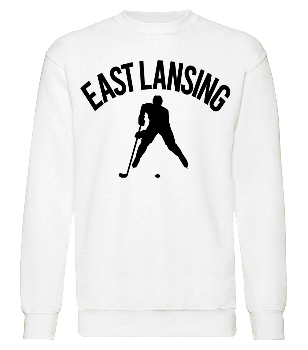 This premium blend sweatshirt proudly displays the hockey loving city of East Lansing, USA in combination with our trademark silhouette. The fabric weight is 8.8 ounces and made from 65% ring spun cotton and 35% polyester. Wash on cold and air dry.