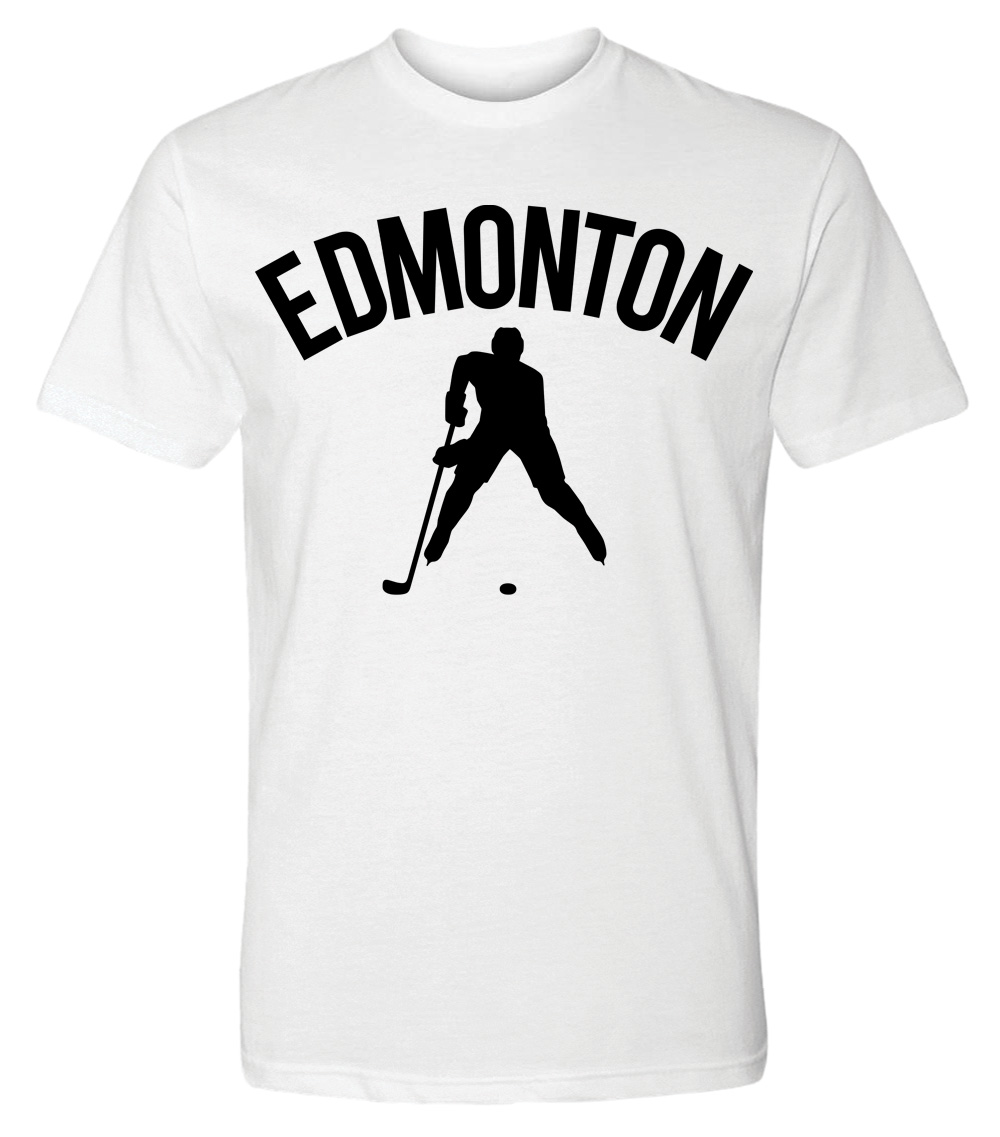 This premium tri-blend short sleeve shirt proudly displays the hockey loving city of Edmonton, CANADA in combination with our trademark silhouette. The fabric weight is 4.5 ounces and made from 25% ring spun cotton, 25% rayon, and 50% polyester. Wash on cold and air dry.