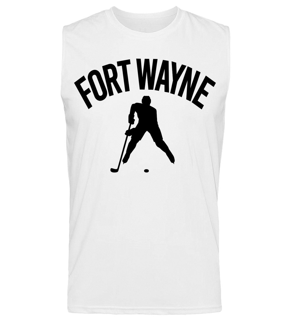 This premium sleeveless muscle shirt proudly displays the hockey loving city of Fort Wayne, USA in combination with our trademark silhouette. The fabric weight is 4 ounces and made from 100% polyester. Wash on cold and air dry.