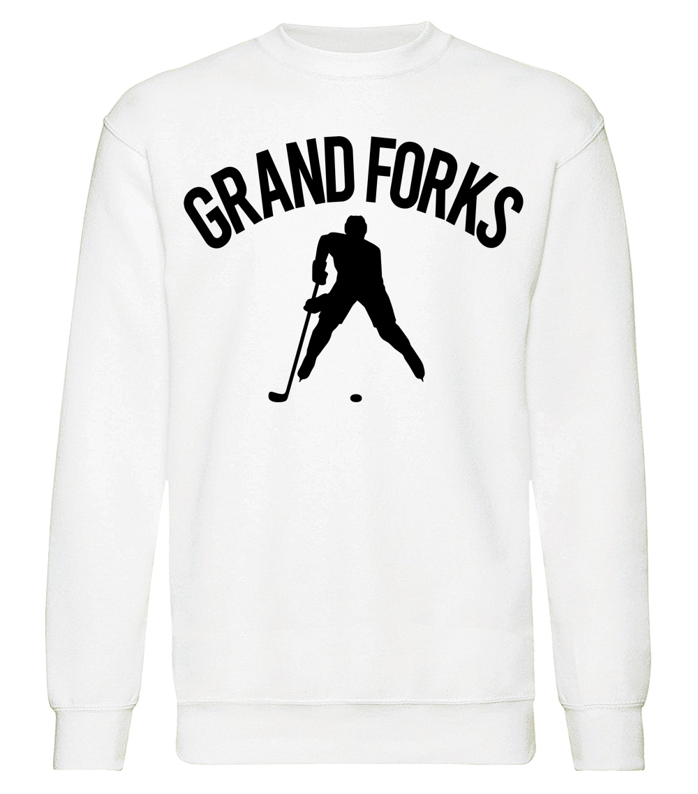 This premium blend sweatshirt proudly displays the hockey loving city of Grand Forks, USA in combination with our trademark silhouette. The fabric weight is 8.8 ounces and made from 65% ring spun cotton and 35% polyester. Wash on cold and air dry.