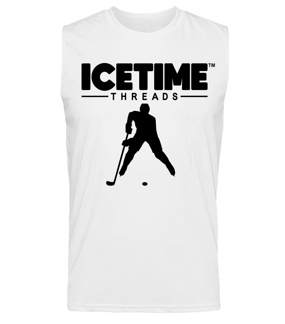 This premium sleeveless muscle shirt displays our signature silhouette, the 'Icetime Threads' design. The fabric weight is 4 ounces and made from 100% polyester. Wash on cold and air dry.