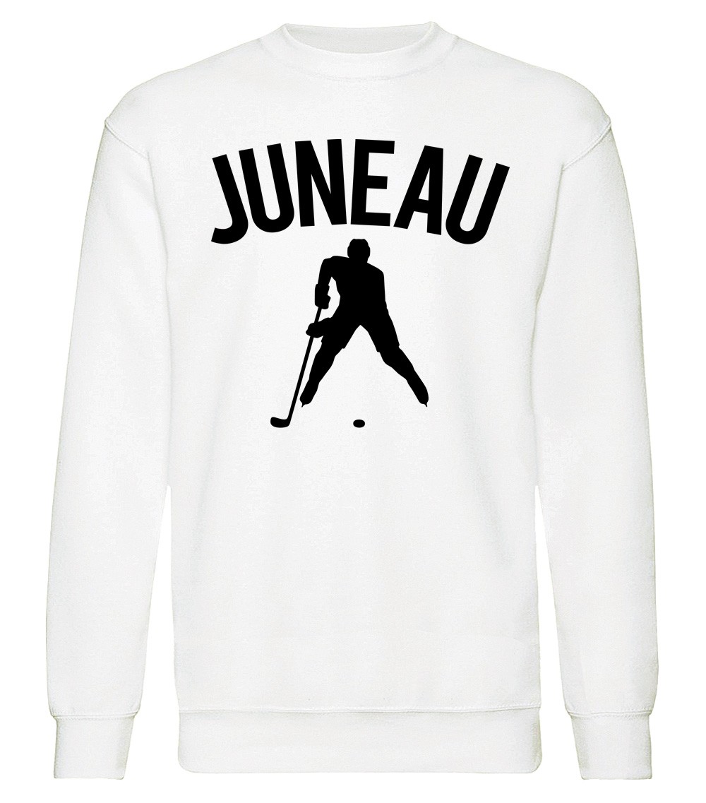 This premium blend sweatshirt proudly displays the hockey loving city of Juneau, USA in combination with our trademark silhouette. The fabric weight is 8.8 ounces and made from 65% ring spun cotton and 35% polyester. Wash on cold and air dry.