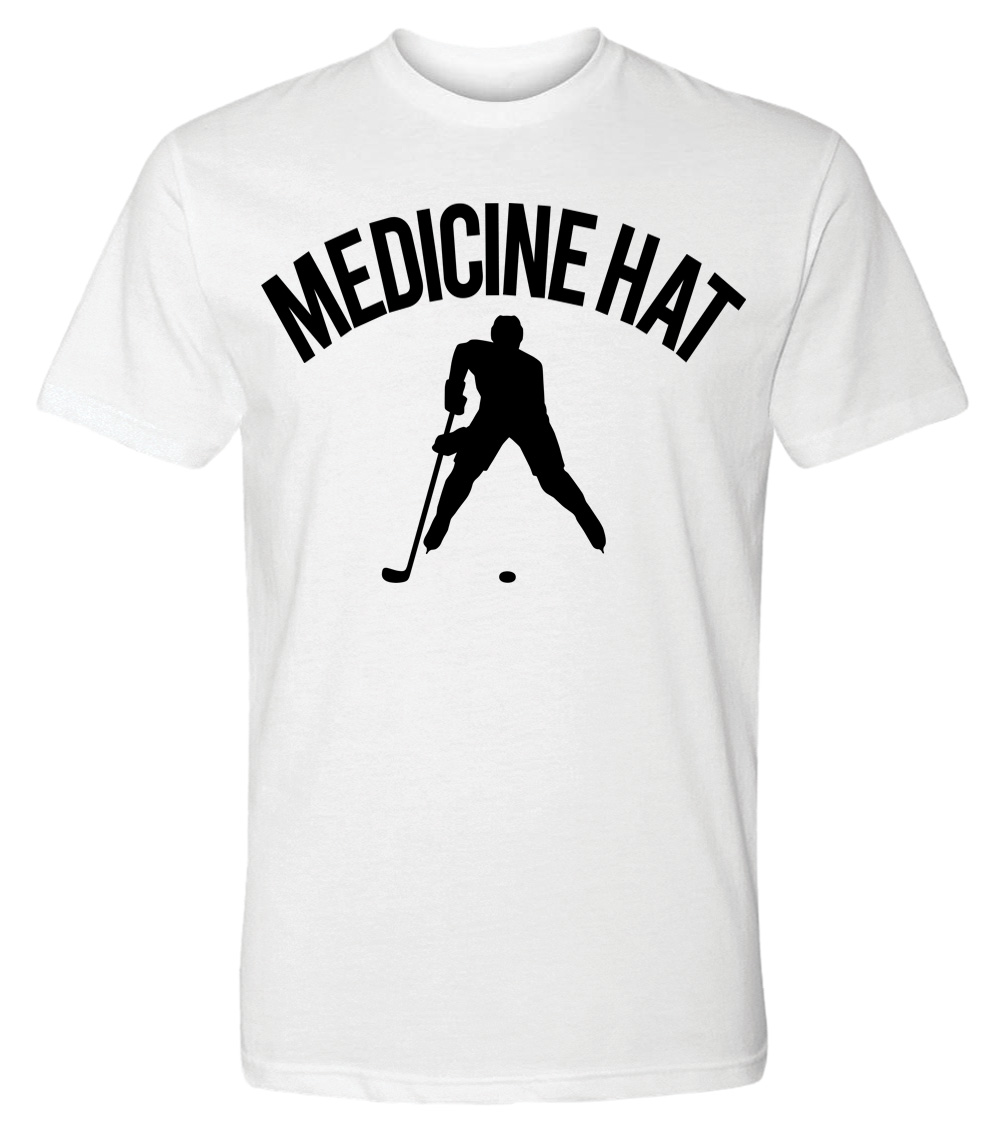 This premium tri-blend short sleeve shirt proudly displays the hockey loving city of Medicine Hat, CANADA in combination with our trademark silhouette. The fabric weight is 4.5 ounces and made from 25% ring spun cotton, 25% rayon, and 50% polyester. Wash on cold and air dry.