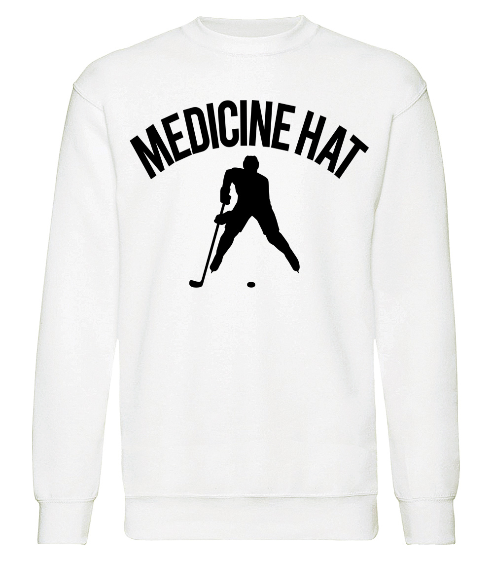 This premium blend sweatshirt proudly displays the hockey loving city of Medicine Hat, CANADA in combination with our trademark silhouette. The fabric weight is 8.8 ounces and made from 65% ring spun cotton and 35% polyester. Wash on cold and air dry.