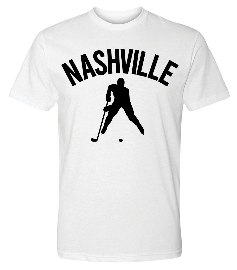 This premium tri-blend short sleeve shirt proudly displays the hockey loving city of Nashville, USA in combination with our trademark silhouette. The fabric weight is 4.5 ounces and made from 25% ring spun cotton, 25% rayon, and 50% polyester. Wash on cold and air dry.