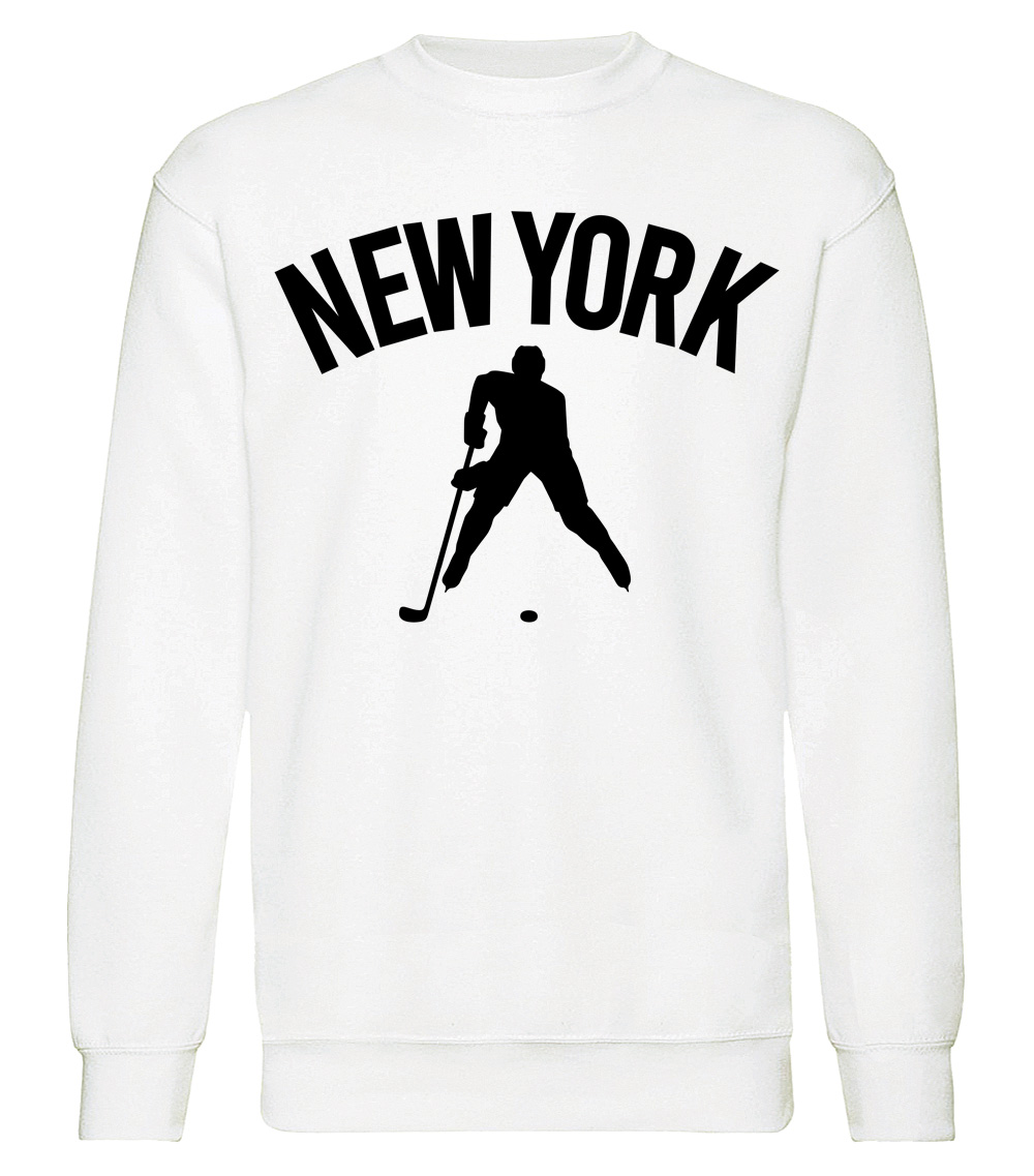 This premium blend sweatshirt proudly displays the hockey loving city of New York, USA in combination with our trademark silhouette. It's design #1 of 4 for New York. The fabric weight is 8.8 ounces and made from 65% ring spun cotton and 35% polyester. Wash on cold and air dry.