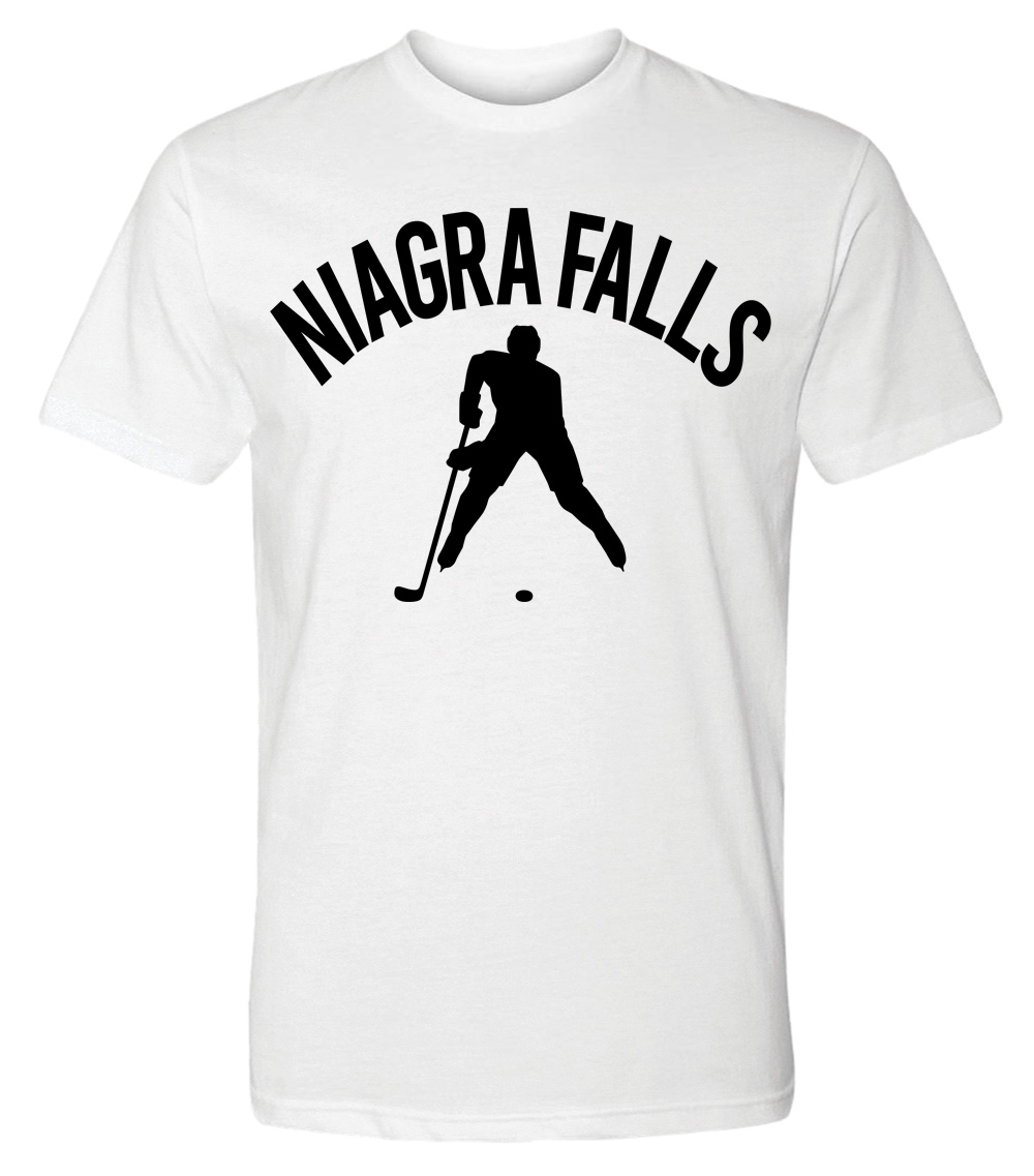 This premium tri-blend short sleeve shirt proudly displays the hockey loving city of Niagra Falls, CANADA in combination with our trademark silhouette. The fabric weight is 4.5 ounces and made from 25% ring spun cotton, 25% rayon, and 50% polyester. Wash on cold and air dry.