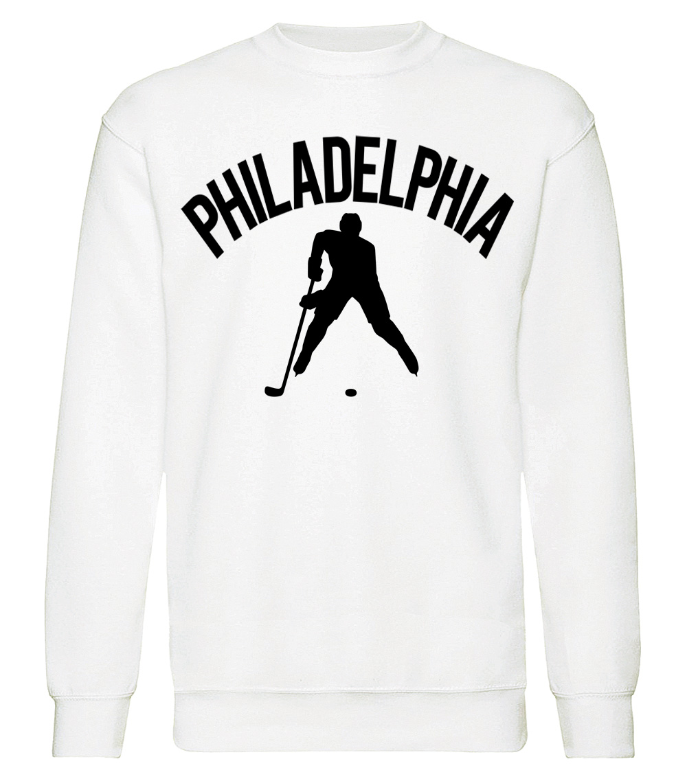 This premium blend sweatshirt proudly displays the hockey loving city of Philadelphia, USA in combination with our trademark silhouette. It's design #1 of 2 for Philadelphia. The fabric weight is 8.8 ounces and made from 65% ring spun cotton and 35% polyester. Wash on cold and air dry.
