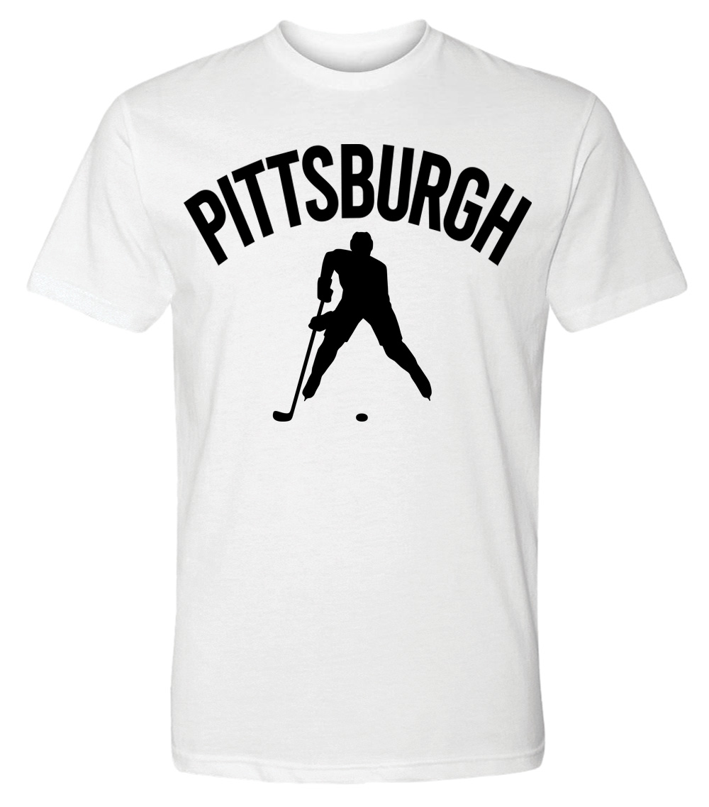 This premium tri-blend short sleeve shirt proudly displays the hockey loving city of Pittsburgh, USA in combination with our trademark silhouette. It's design #1 of 2 for Pittsburgh. The fabric weight is 4.5 ounces and made from 25% ring spun cotton, 25% rayon, and 50% polyester. Wash on cold and air dry.