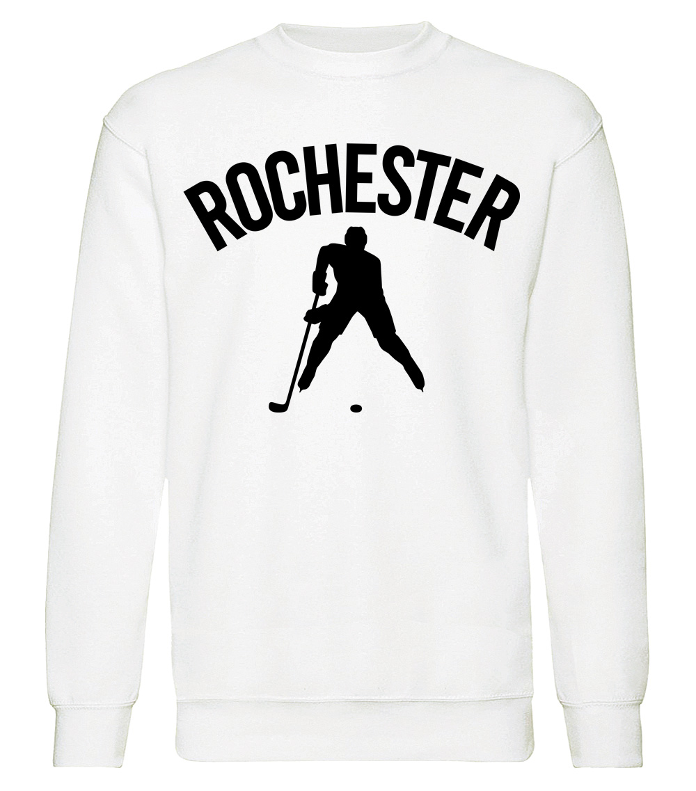 This premium blend sweatshirt proudly displays the hockey loving city of Rochester, USA in combination with our trademark silhouette. The fabric weight is 8.8 ounces and made from 65% ring spun cotton and 35% polyester. Wash on cold and air dry.