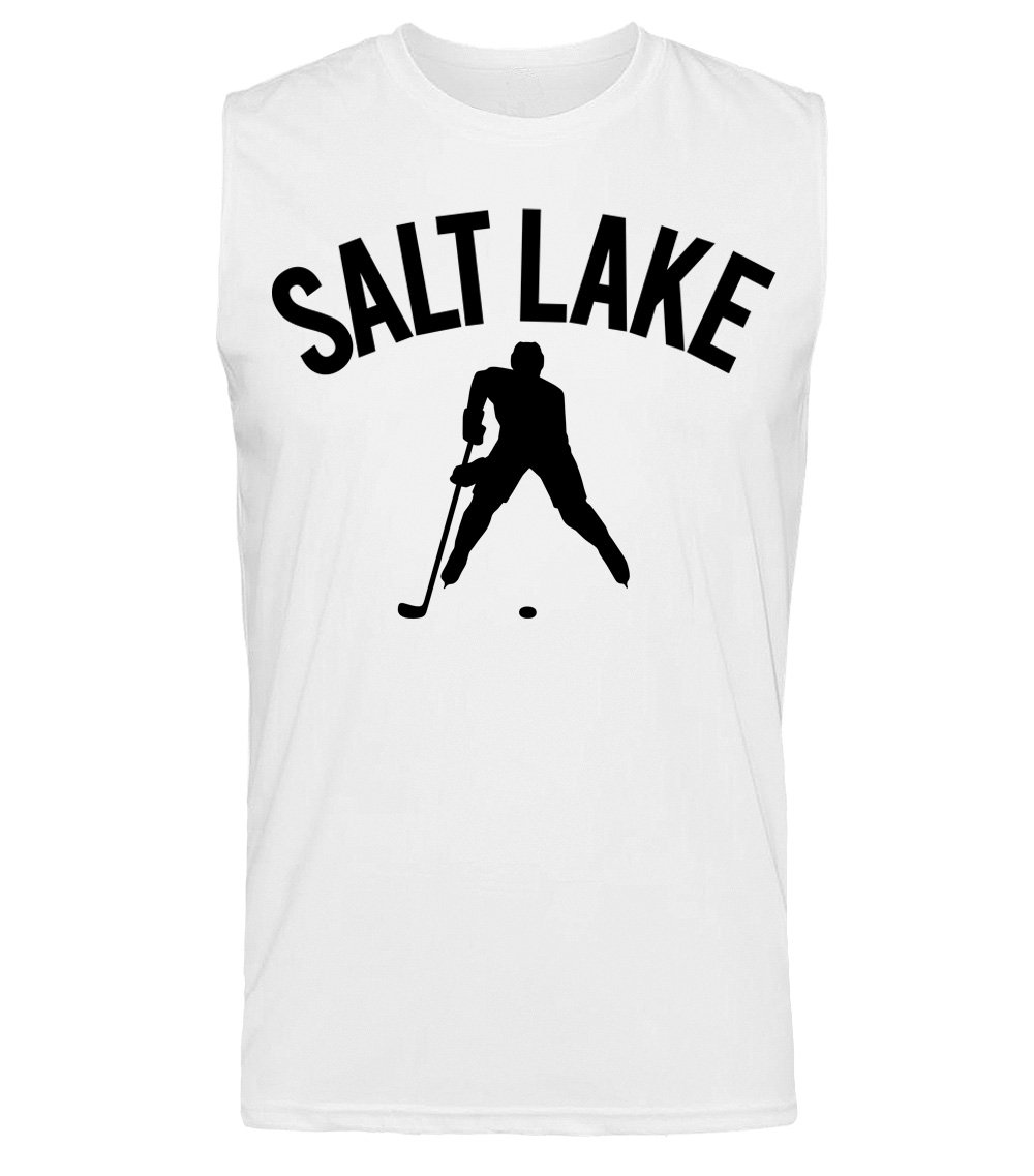 This premium sleeveless muscle shirt proudly displays the hockey loving city of Salt Lake, USA in combination with our trademark silhouette. The fabric weight is 4 ounces and made from 100% polyester. Wash on cold and air dry.