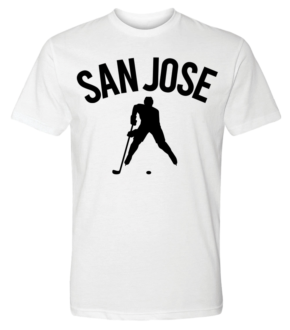This premium tri-blend short sleeve shirt proudly displays the hockey loving city of San Jose, USA in combination with our trademark silhouette. The fabric weight is 4.5 ounces and made from 25% ring spun cotton, 25% rayon, and 50% polyester. Wash on cold and air dry.