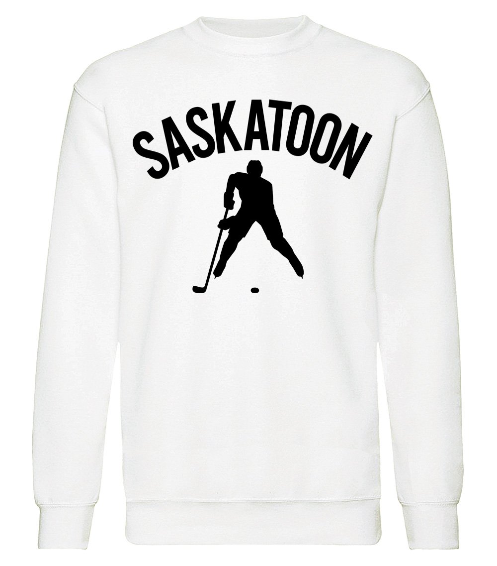 This premium blend sweatshirt proudly displays the hockey loving city of Saskatoon, CANADA in combination with our trademark silhouette. The fabric weight is 8.8 ounces and made from 65% ring spun cotton and 35% polyester. Wash on cold and air dry.