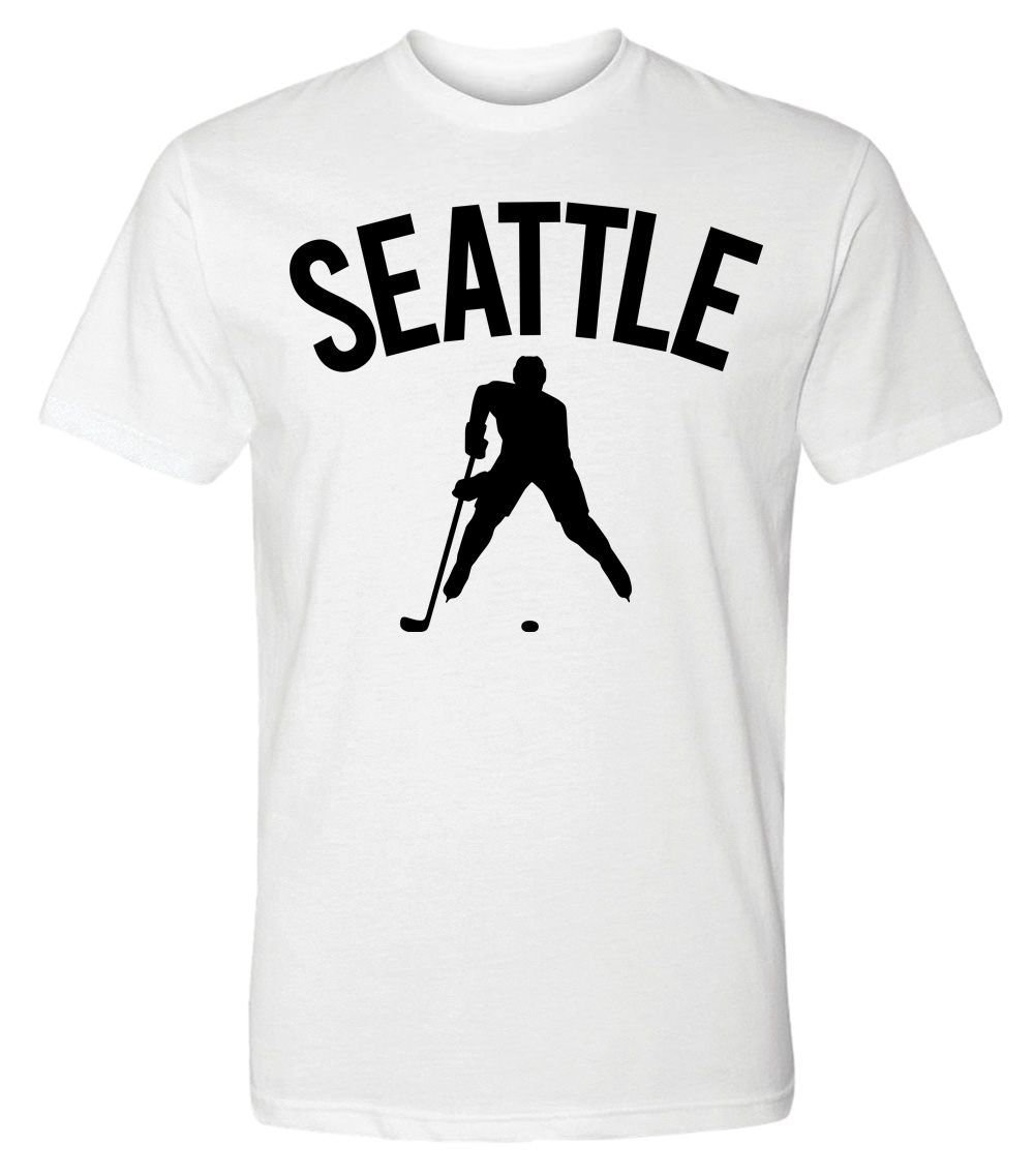 This premium tri-blend short sleeve shirt proudly displays the hockey loving city of Seattle, USA in combination with our trademark silhouette. The fabric weight is 4.5 ounces and made from 25% ring spun cotton, 25% rayon, and 50% polyester. Wash on cold and air dry.