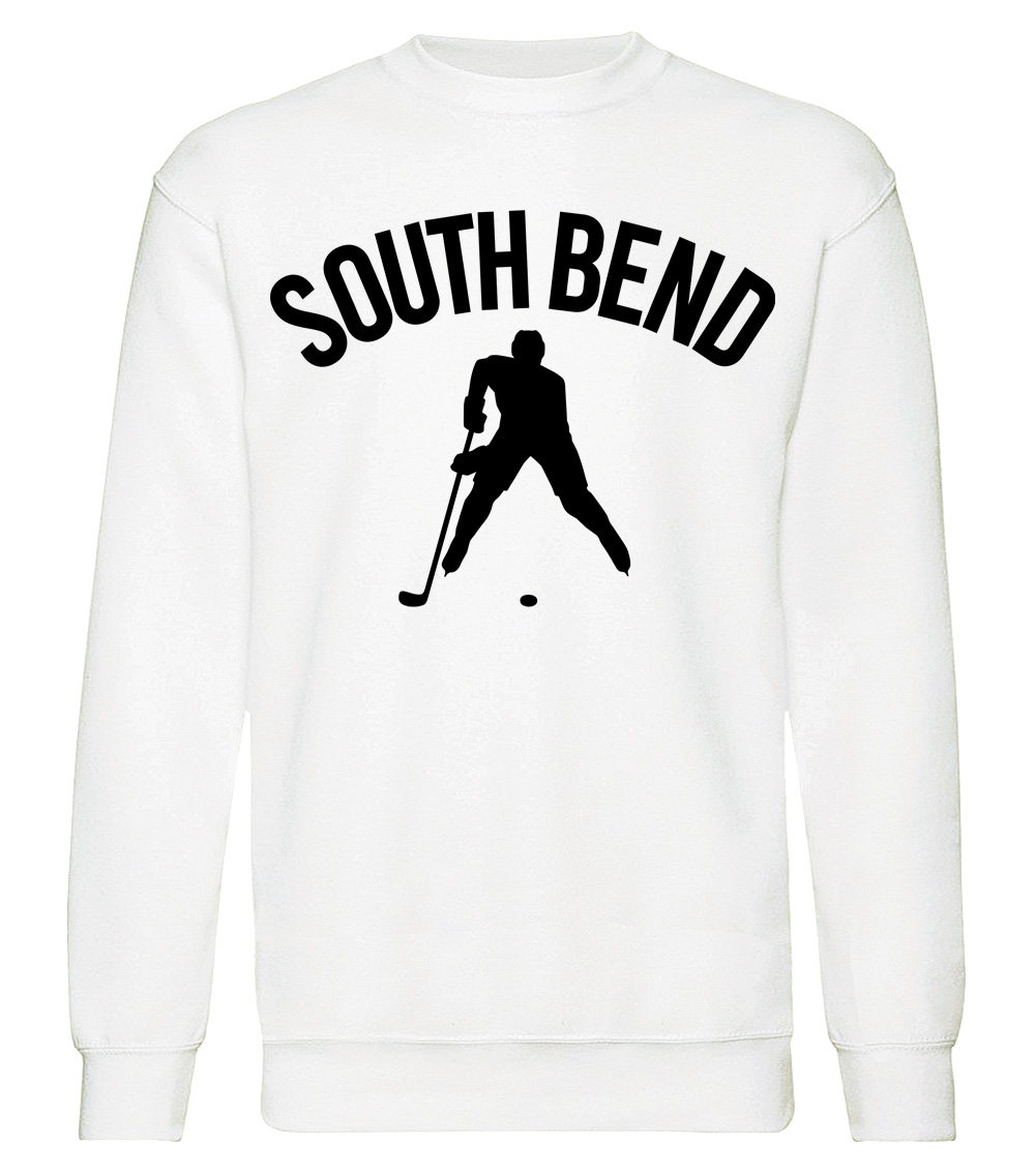 This premium blend sweatshirt proudly displays the hockey loving city of South Bend, USA in combination with our trademark silhouette. The fabric weight is 8.8 ounces and made from 65% ring spun cotton and 35% polyester. Wash on cold and air dry.