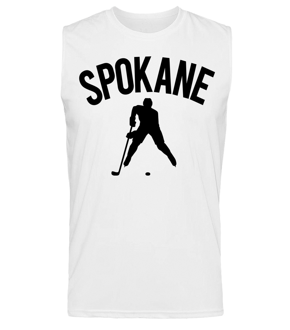 This premium sleeveless muscle shirt proudly displays the hockey loving city of Spokane, USA in combination with our trademark silhouette. The fabric weight is 4 ounces and made from 100% polyester. Wash on cold and air dry.
