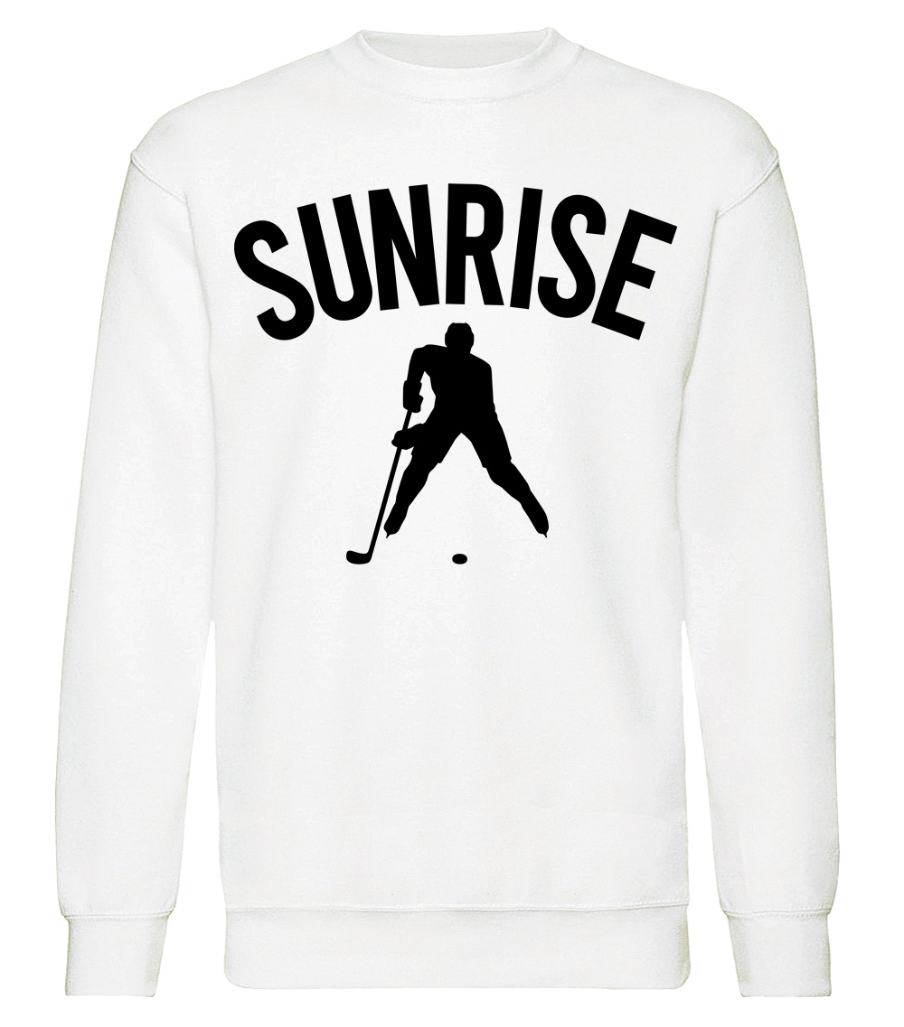 This premium blend sweatshirt proudly displays the hockey loving city of Sunrise, USA in combination with our trademark silhouette. The fabric weight is 8.8 ounces and made from 65% ring spun cotton and 35% polyester. Wash on cold and air dry.