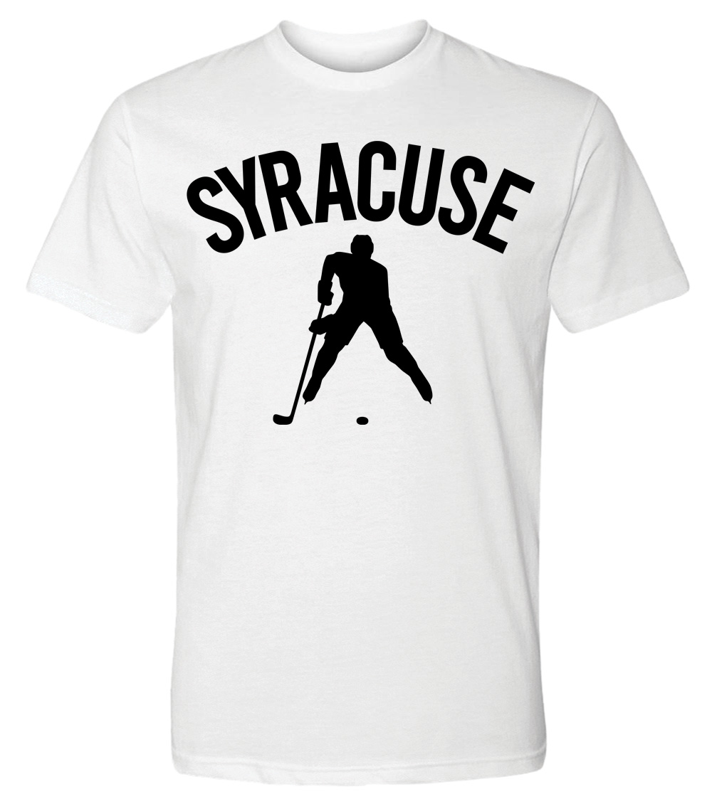 This premium tri-blend short sleeve shirt proudly displays the hockey loving city of Syracuse, USA in combination with our trademark silhouette. The fabric weight is 4.5 ounces and made from 25% ring spun cotton, 25% rayon, and 50% polyester. Wash on cold and air dry.