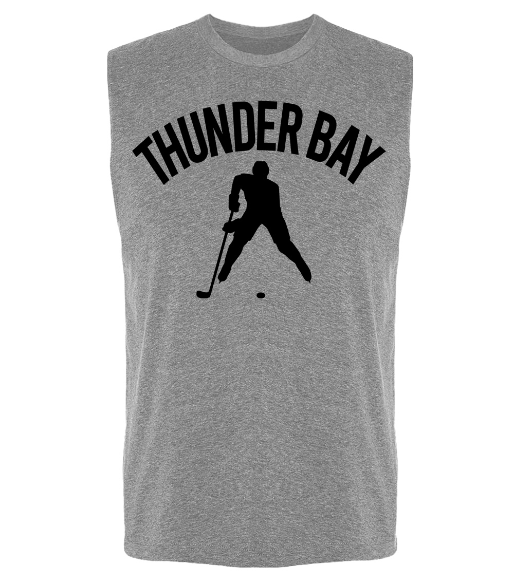 This premium sleeveless muscle shirt proudly displays the hockey loving city of Thunder Bay, CANADA in combination with our trademark silhouette. The fabric weight is 4 ounces and made from 100% polyester. Wash on cold and air dry.